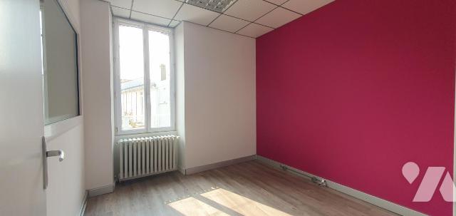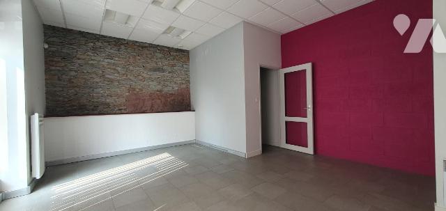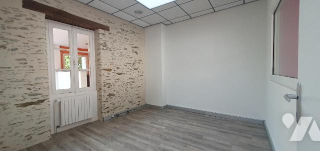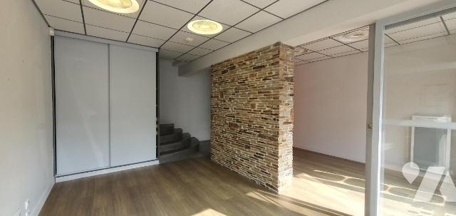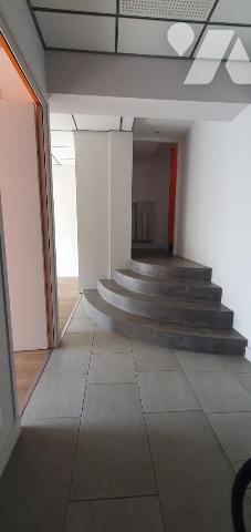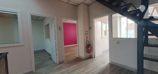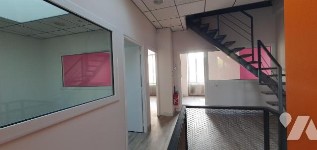 A l'étage: Grand palier, trois bureaux, cuisine, sanitaires et pièce aveugle en mezzanine.